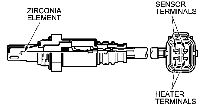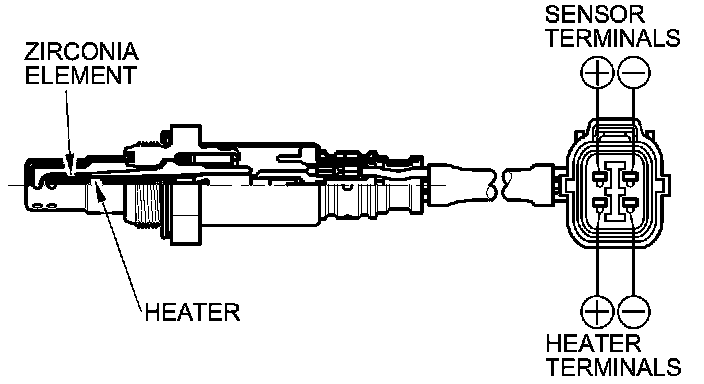 The secondary HO2S detects the oxygen content in the exhaust gas downstream of the three way catalytic converter (TWC), and sends signals to the ECM/PCM. To stabilize its output, the sensor has an internal heater. The ECM/PCM compares the HO2S output with the A/F sensor output to determine catalyst efficiency. The secondary HO2S is on the TWC.