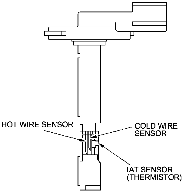 The mass air flow (MAF) sensor/intake air temperature (IAT) sensor contains a hot wire sensor, a cold wire sensor, and a thermistor. It is in the intake air passage. The resistance of the hot wire sensor, the cold wire sensor, and the thermistor changes due to intake air temperature and air flow. The control circuit in the MAF sensor controls the current to keep the hot wire at a set temperature. The current is converted to voltage in the control circuit, then output to the ECM/PCM.