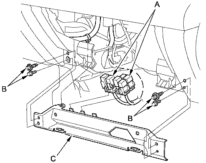 12. Remove the relays (A), then remove the bolts (B), and the glove box frame (C).