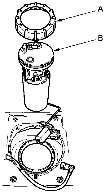 7. Remove the locknut (A) and the fuel tank unit (B).