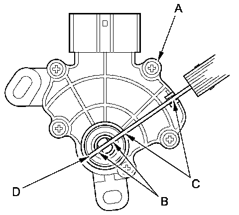 7. Set a new transmission range switch (A) to the N position. Align the cutouts (B) on the rotary-frame with the neutral positioning cutouts (C) on the transmission range switch. Then put a 2 mm (0.08 in) feeler gauge blade (D) in the cutouts to hold the transmission range switch in the N position.