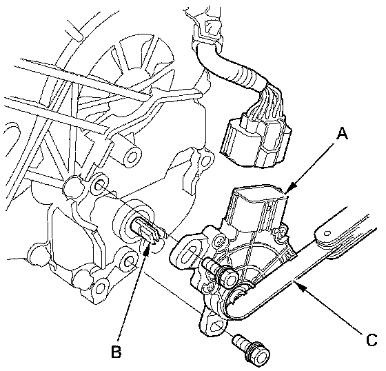 8. Install the transmission range switch (A) gently on the selector control shaft (B) while holding it in the N position with the 2 mm (0.08 in) blade (C).