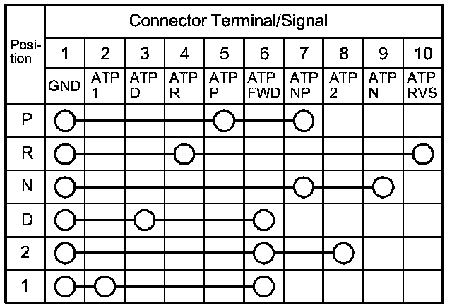 6. Check for continuity between the terminals at the transmission range switch connector. There should be continuity between the terminals in the following table for each shift lever position.