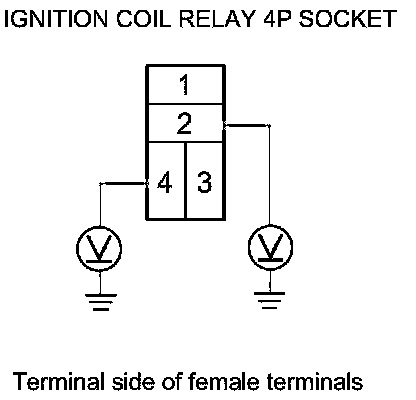 3. Measure the voltage between body ground and ignition coil relay 4P socket terminal No. 2 and No. 4 individually.