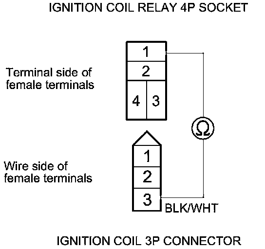 4. Check for continuity between ignition coil relay 4P socket terminal No. 1 and each ignition coil 3P connector terminal No. 3.
