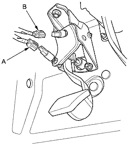 1. Disconnect the clutch pedal position switch connector (A) and the clutch interlock switch connector (B).
