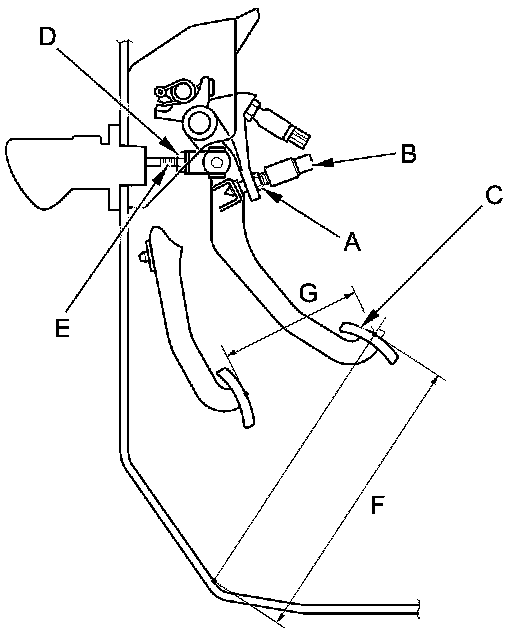 3. Loosen the clutch pushrod locknut (D), and turn the pushrod (E) in or out to get the specified height (F), and the stroke (G) at the clutch pedal. If adjusting the pushrod causes the clutch pedal to contact the clutch pedal position switch, back off the switch further.