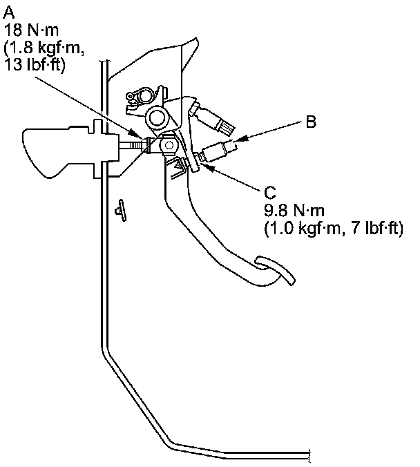 2. Loosen the clutch pedal position switch locknut (A), and back off the clutch pedal position switch (B) until it no longer touches the clutch pedal (C).