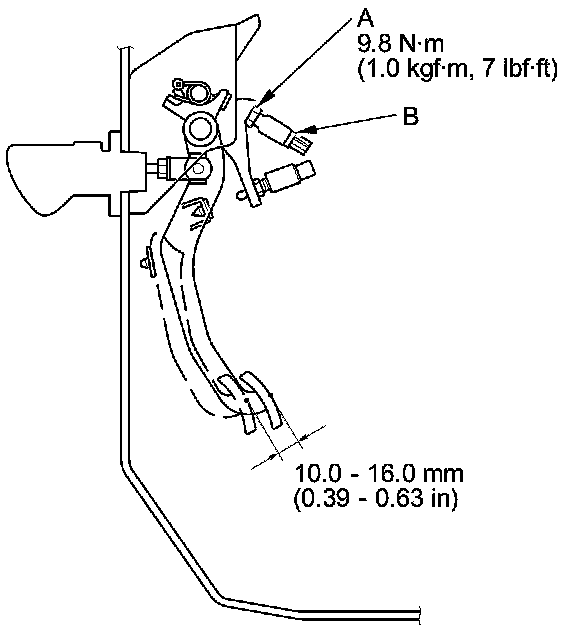 9. Fully press the clutch pedal to the floor, then release the clutch pedal 10.0-16.0 mm (0.39-0.63 in) and hold it there.