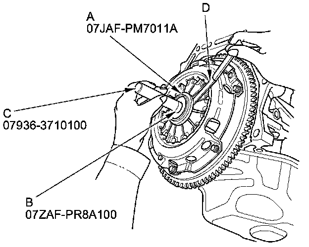 2. Check the evenness of the height of the diaphragm spring fingers using the clutch alignment disc (A), the clutch alignment shaft (B), the remover handle (C), and a feeler gauge (D). If the height difference is more than the service limit, replace the pressure plate.