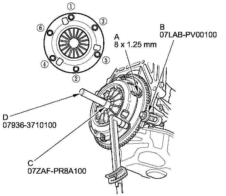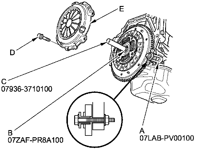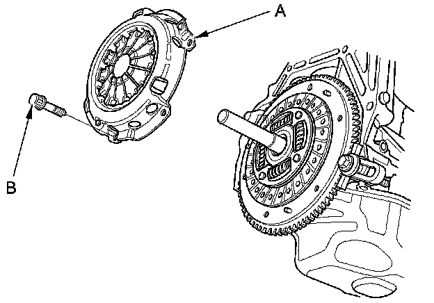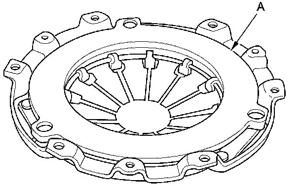 28. Torque the pressure plate mounting bolts (A) in a crisscross pattern. Tighten the bolts in several steps to prevent warping the diaphragm spring. Make sure that there is no clearance between the pressure plate and the flywheel.