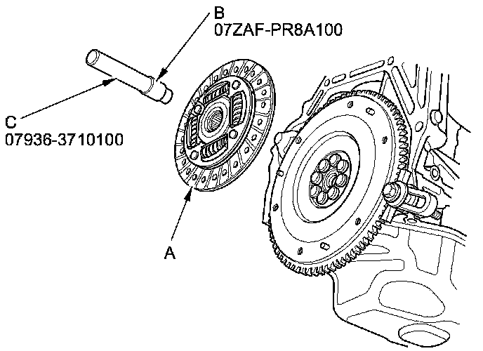 8. Remove the clutch disc (A), the clutch alignment shaft (B), and the remover handle (C).