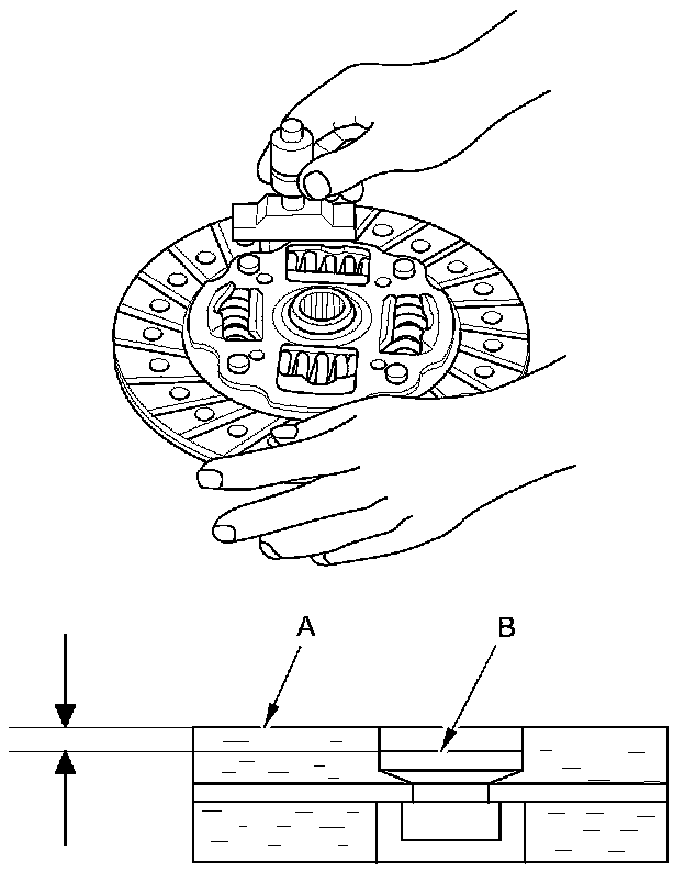 11. Measure the depths of the rivets from the clutch disc lining surface (A) to the rivets (B) on both sides. If the measurement is less than the service limit, replace the clutch disc.