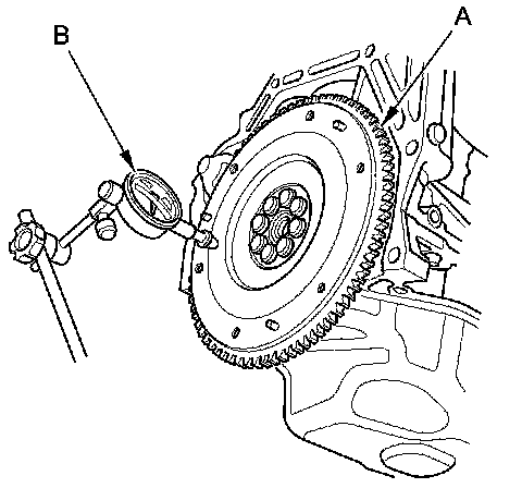 15. Measure the flywheel (A) runout using a dial indicator (B). Through at least two full turns with pushing against the flywheel each time you turn it to take up the crankshaft thrust washer clearance. If the measurement is not within the standard, replace the flywheel, and recheck the runout; go to step 16.