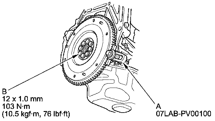 19. Install the ring gear holder (A), then torque the flywheel mounting bolts (B) in a crisscross pattern in several steps.