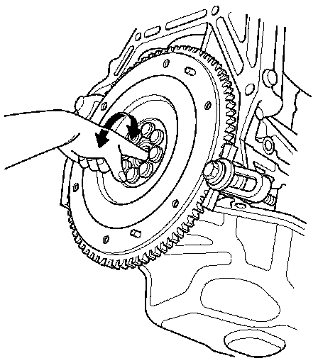 17. Loosen the flywheel mounting bolts in a crisscross pattern in several steps. Remove the bolts, then remove the flywheel and the ring gear holder.