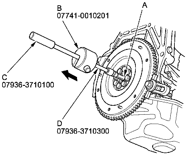 22. Remove the crankshaft pilot bushing (A) using the remover weight (B), the remover handle (C), and the 17 mm bearing remover shaft set (D).