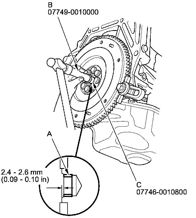 23. Install a new crankshaft pilot bushing (A) into the crankshaft using the 15 x 135L driver handle (B) and the 22 x 24 mm bearing driver attachment (C).