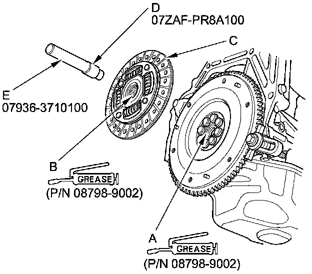 26. Apply super high temp urea grease (P/N 08798-9002) to the splines (B) of the clutch disc (C), then install the clutch disc using the clutch alignment shaft (D) and the remover handle (E).