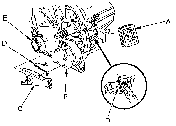 3. Remove the release fork (C) from the clutch housing by squeezing the release fork set spring (D) with pliers. Remove the release bearing (E).