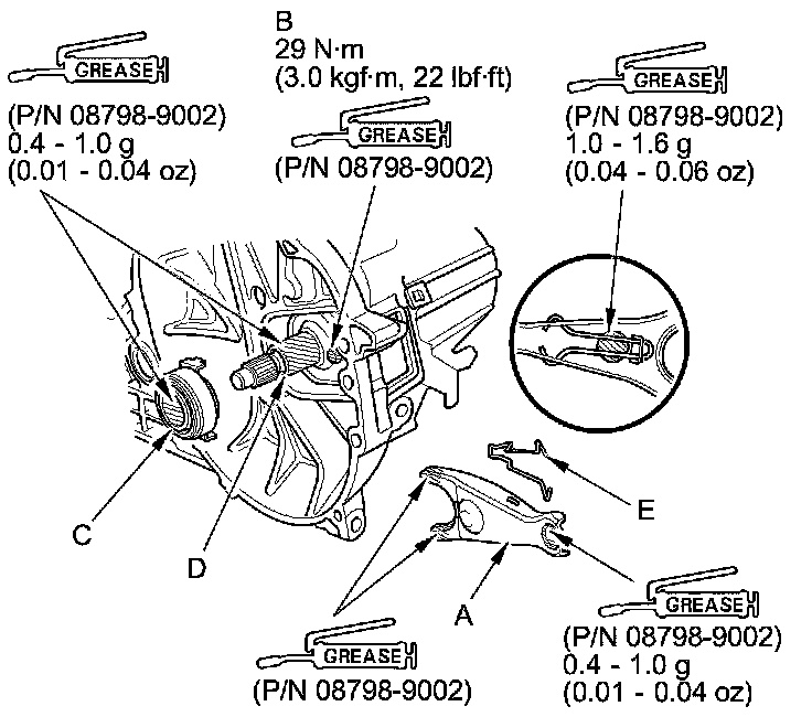 5. Apply super high temp urea grease (P/N 08798-9002) to the release fork (A), the release fork bolt (B), the release bearing (C), and the release bearing guide (D) in the shaded areas, then set the release fork set spring (E).
