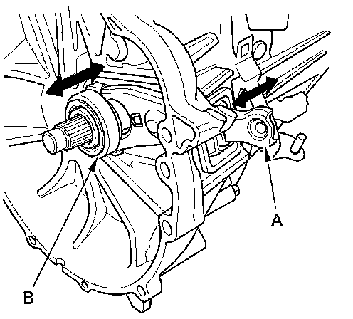 9. Move the release fork (A) right and left to make sure that it fits properly against the release bearing (B) and that the release bearing slides smoothly. Wipe off any excess grease.