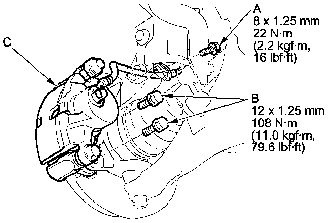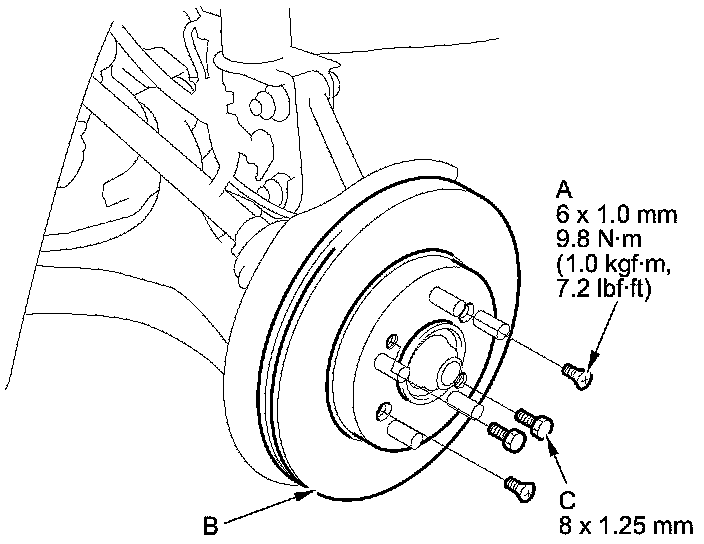 NOTE: If the brake disc is stuck to the hub, screw two 8 x 1.25 mm bolts (C) into the brake disc to push it away from the hub. Turn each bolt 90 degrees a time to prevent the brake disc from binding.