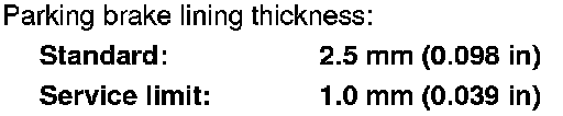 6. If any part of the parking brake lining thickness is less than the service limit, replace all of the parking brake shoes as a set Removal and Replacement.