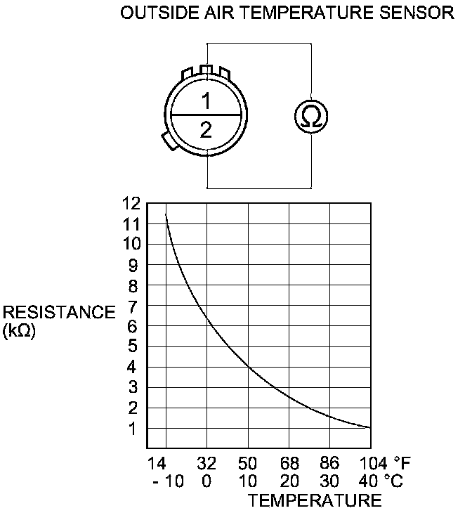 3. Compare the resistance reading between terminals No. 1 and No. 2 of the outside air temperature sensor with the specifications shown in the graph; the resistance should be within the specifications.