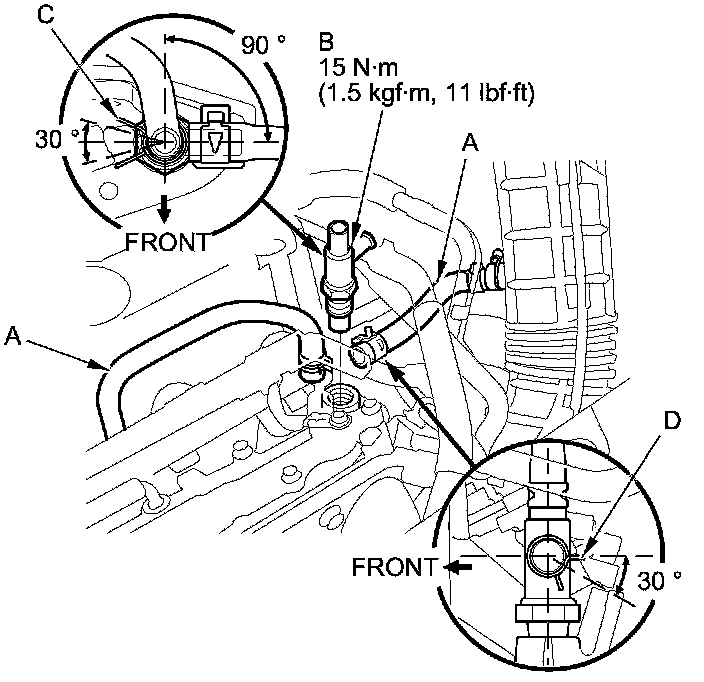 - Position the intake air bypass control thermal valve and the clamp (C) as shown.
