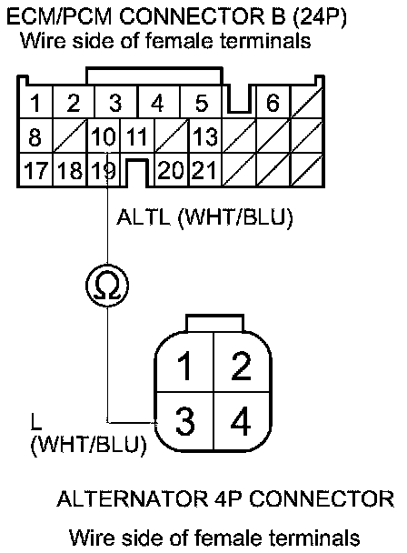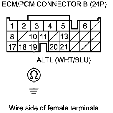 25. Check for continuity between ECM/PCM connector terminal B10 and alternator 4P connector terminal No. 3.