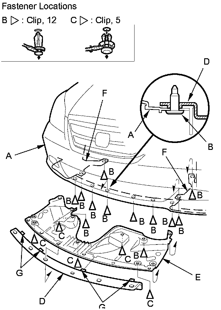 1. From under the front bumper (A), remove the clips (B, C) securing the front bumper, the front bumper air spoiler (D), the front splash shield (E), and the front inner fender (F) on the front subframe and the body.