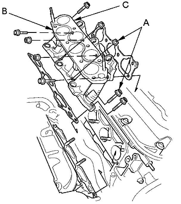 6. Remove the injector base mounting bolts/nuts (A), then remove the front injector base (B) and the rear injector base (C).