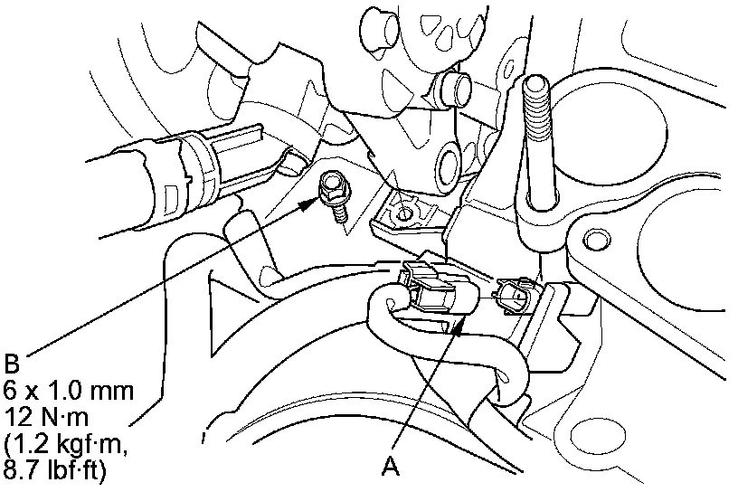 2. Connect the knock sensor connector (A) and install the harness holder mounting bolt (B).