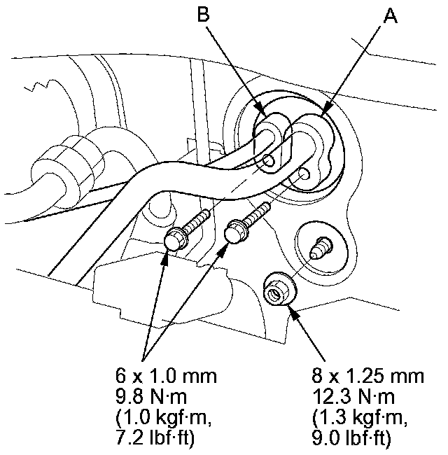 3. Remove the bolts and nut, then disconnect the suction line (A) and the receiver line (B) from the front evaporator core.