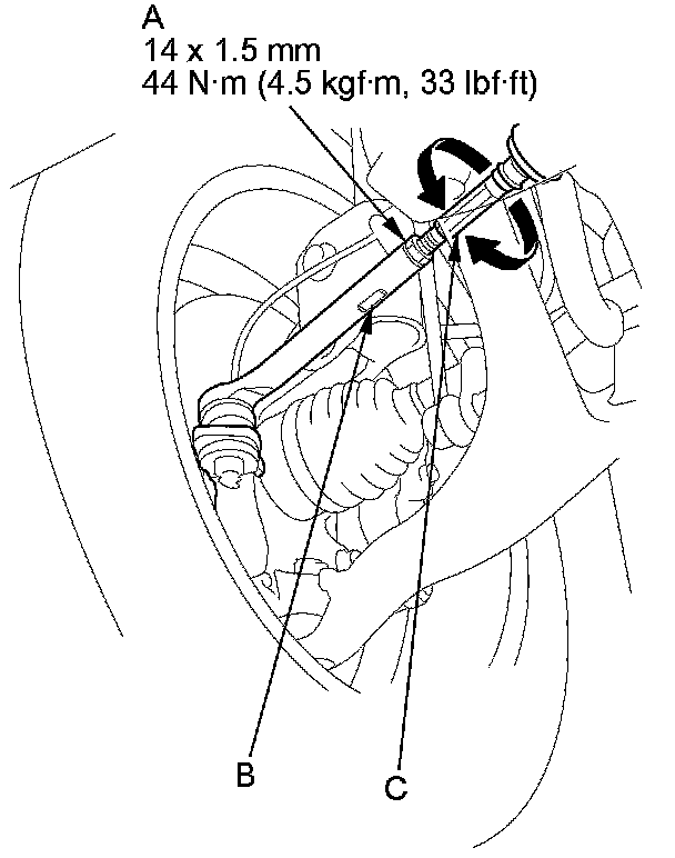 4. Loosen the tie-rod locknuts (A) while holding the flat surface sections (B) of the tie-rod end with a wrench. Turn both tie-rods (C) until the front toe is within specifications.