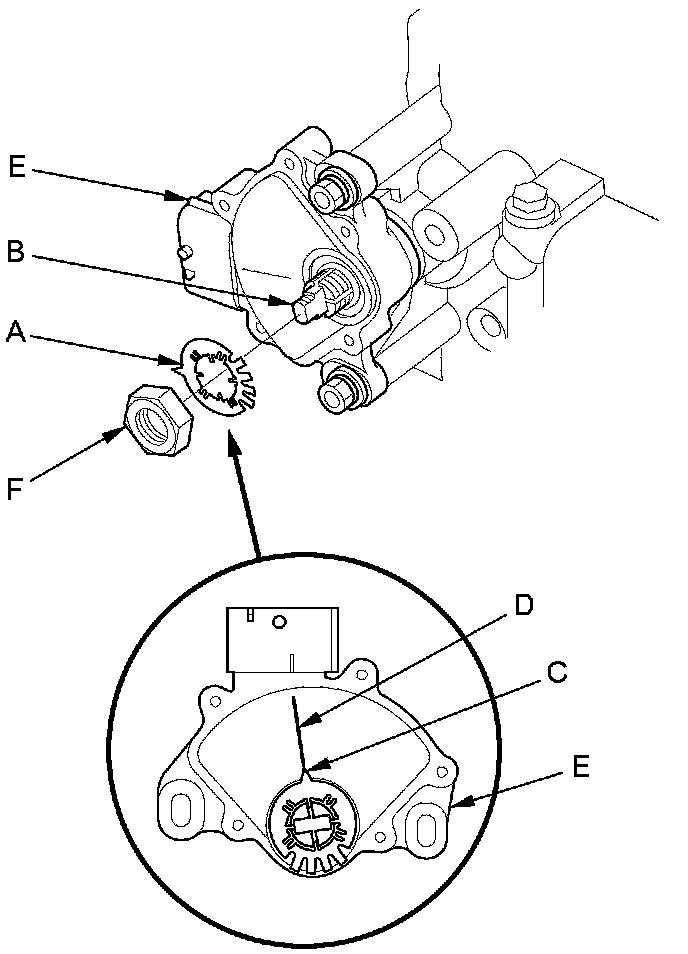 13. Install a new lock washer (A) over the selector control shaft (B) by aligning the indicator tab (C) of the lock washer with the N positioning line (D) on the transmission range switch (E), and install the locknut (F).