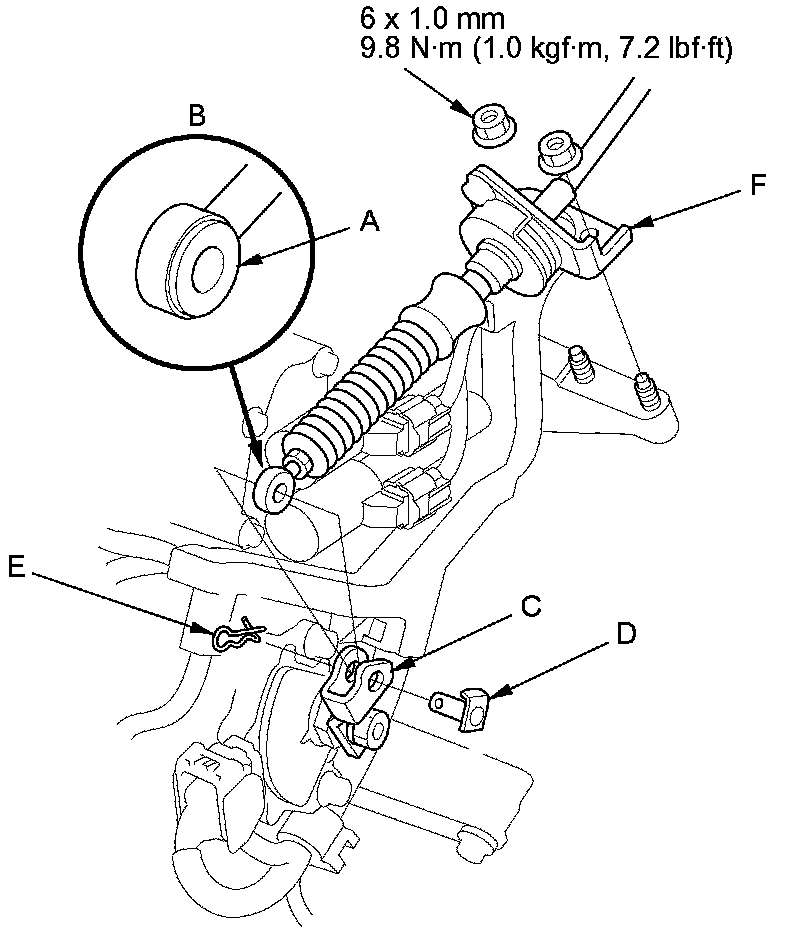 18. Apply molybdenum grease to the hole in the bushing (A) in the shift cable end (B). Attach the shift cable end to the selector control lever (C), then insert the control pin (D) into the selector control lever hole through the shift cable end, and secure the control pin with the spring clip (E).