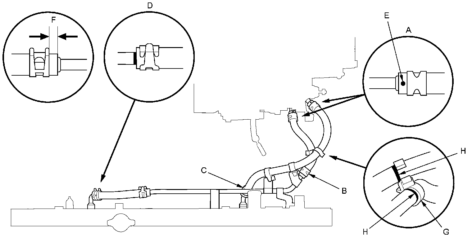 2. Secure the ATF cooler hoses with the clamp (G) at the white paint lines (H).