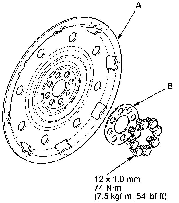 2. Remove the drive plate (A) and the washer (B) from the engine crankshaft.
