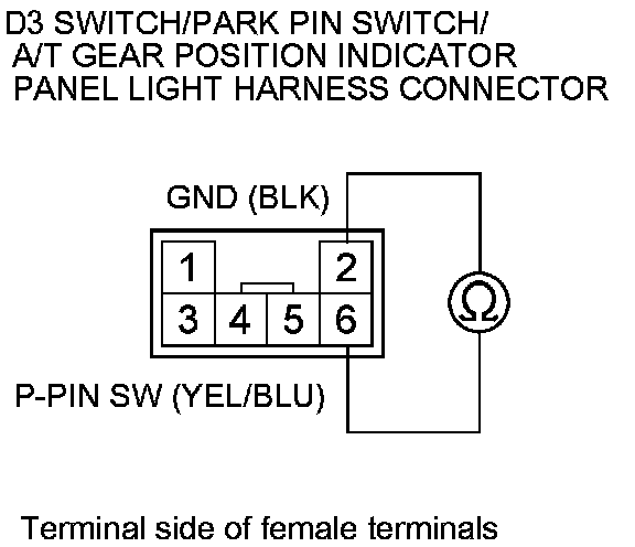 8. Check for continuity between D3 switch/park pin switch/A/T gear position indicator panel light harness connector terminals No. 2 and No. 6 with the shift lever in P, and with the shift lever out of P.
