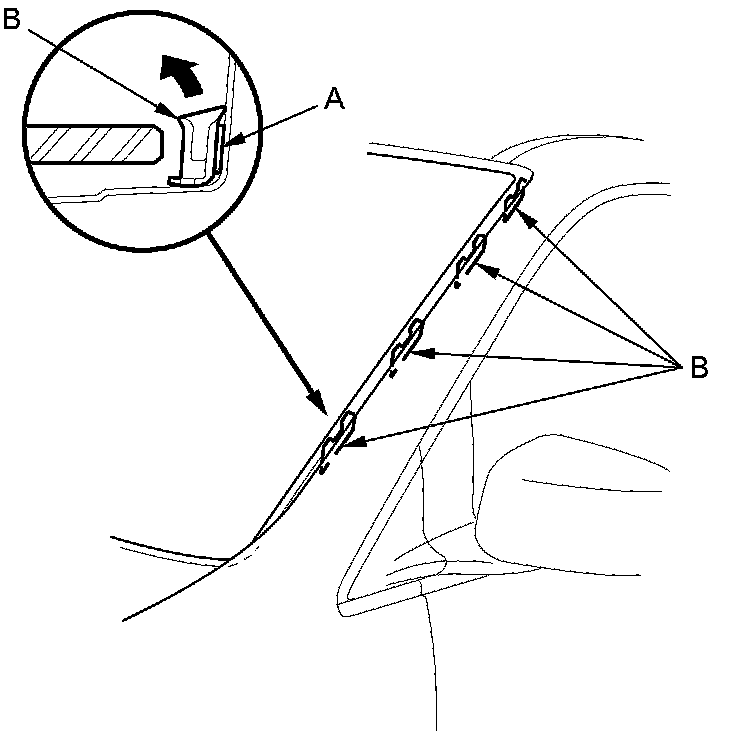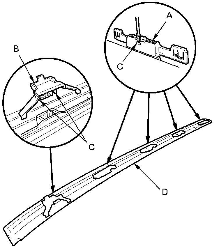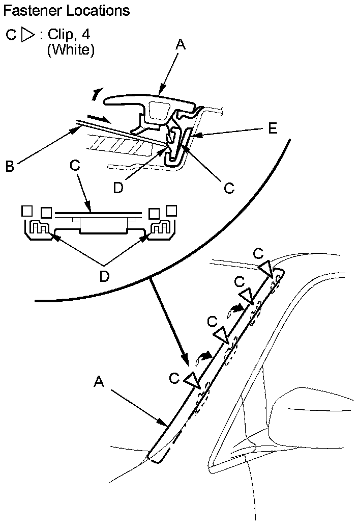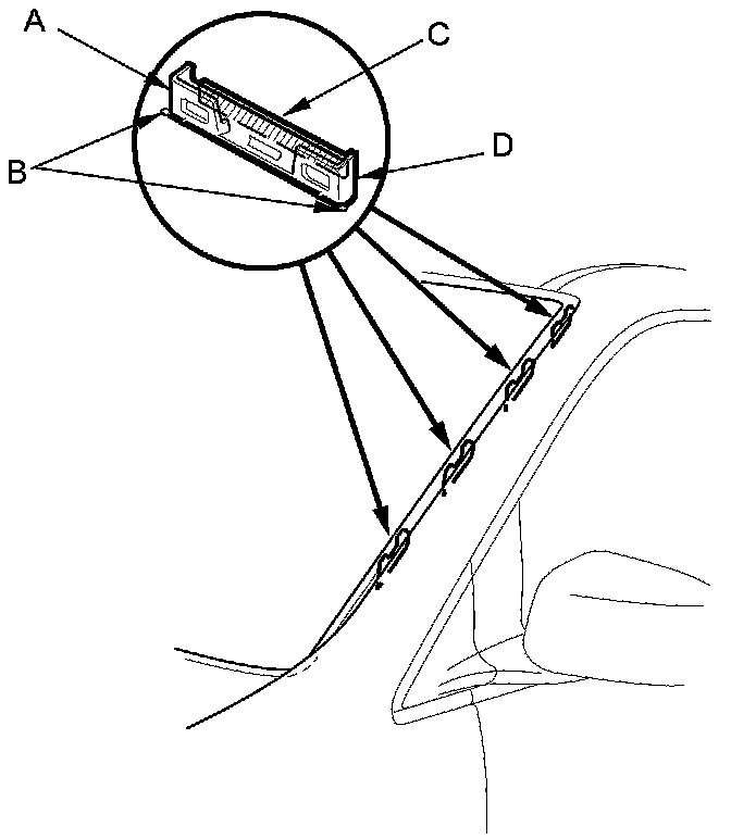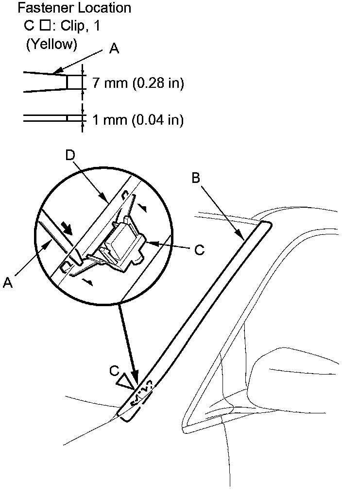 7. Hold the windshield side trim (A) up, and fit all of the clips (B) into the retainers (C) on the body and the clip (D) to the windshield, then push on the trim until the clips snap into place.
