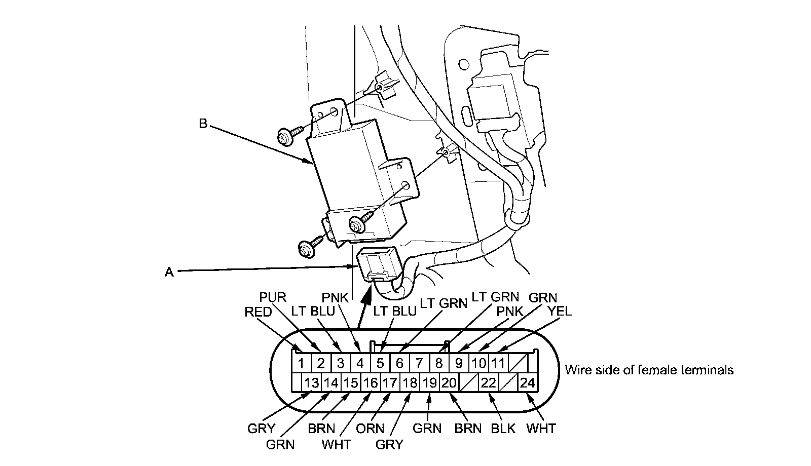3. Disconnect the 24P connector (A) from the power mirror control unit (B).