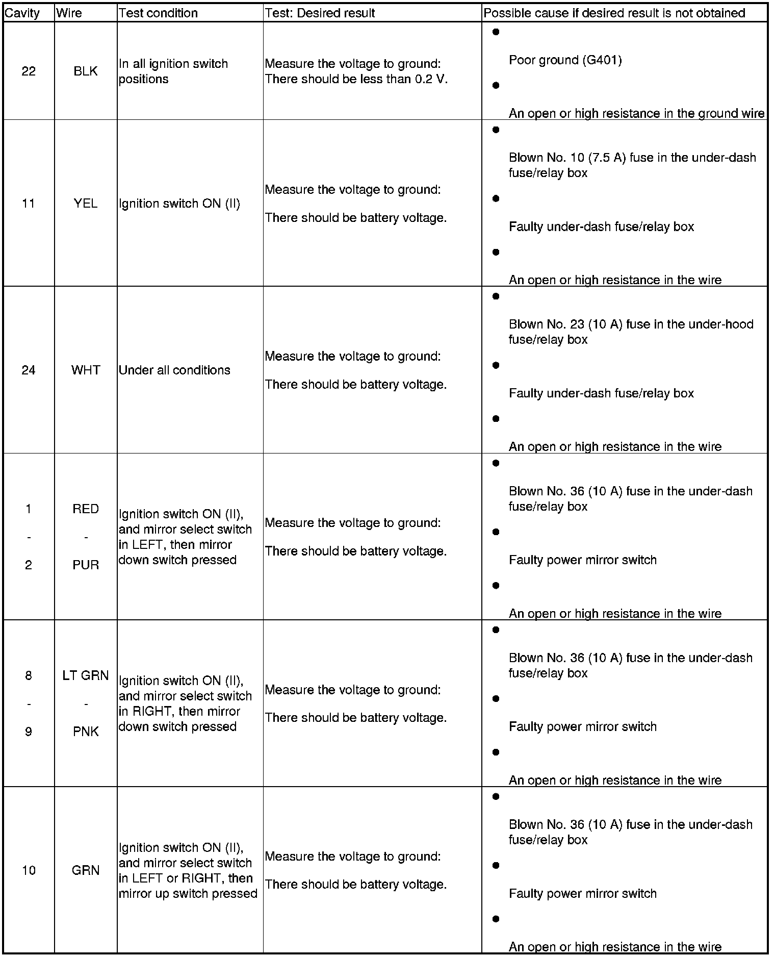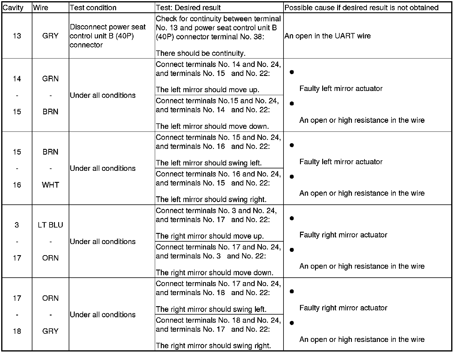 6. Reconnect the connector to the power mirror control unit, and do the following input tests.