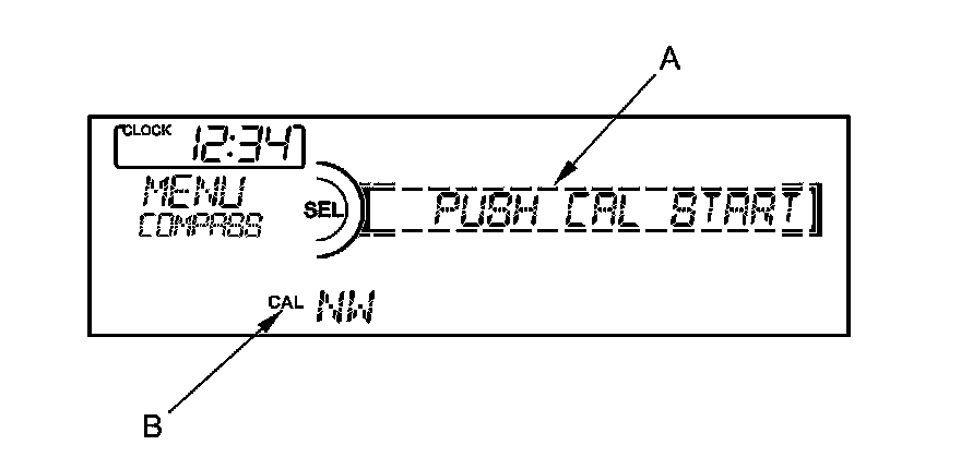 7. While the system calibrates, the azimuth (direction) display (A) blinks and the CAL indicator (B) is shown.