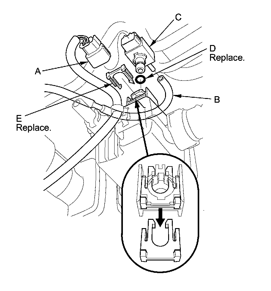5. Install the parts in the reverse order of removal with a new O-ring (D) and a new retainer (E).