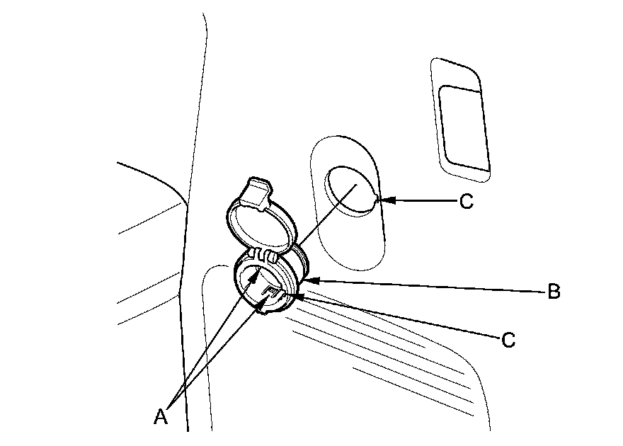 7. Gently depress the tabs (A), then remove the housing (B) from the panel. Note the location of the indexing tabs (C).