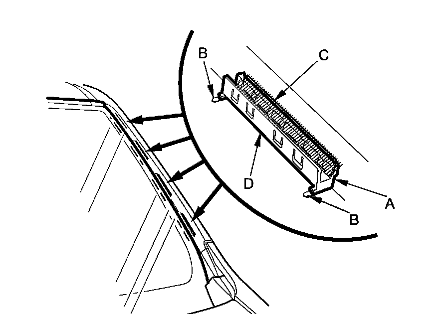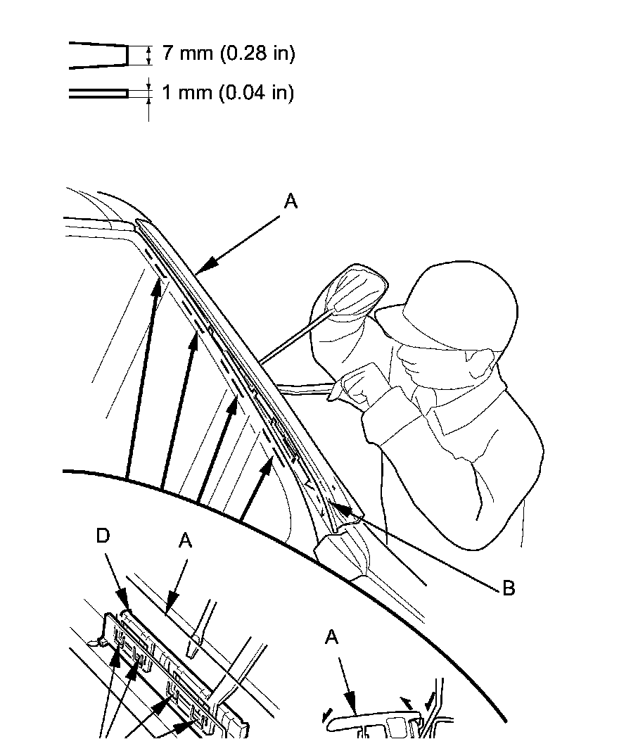 2. While pulling the retainer section of the trim up with a trim tool, push each of the four small hooks (C) with a small flat-tip screwdriver to release the trim from the retainer (D) on the A-pillar. Do not pry on the windshield trim anywhere except the retainer section.