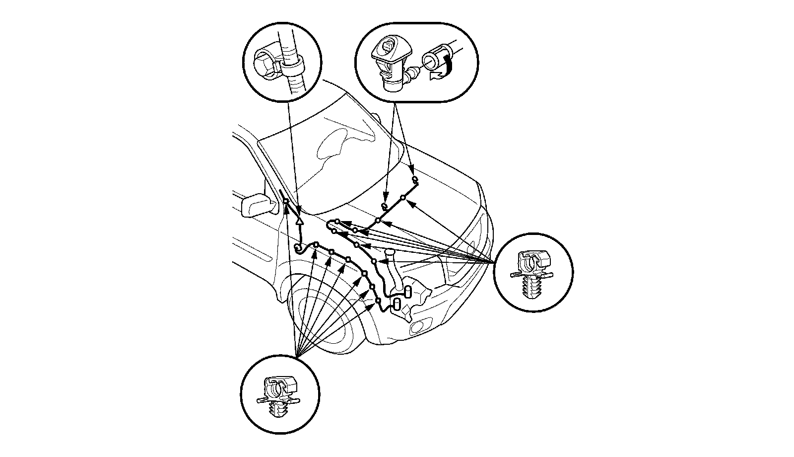 1. Remove the washer nozzles and clips, then remove the washer tubes.