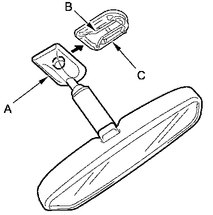 4. Slide the rearview mirror (A) down toward the bottom of the windshield to detach it from the spring (B) in the mount (C).